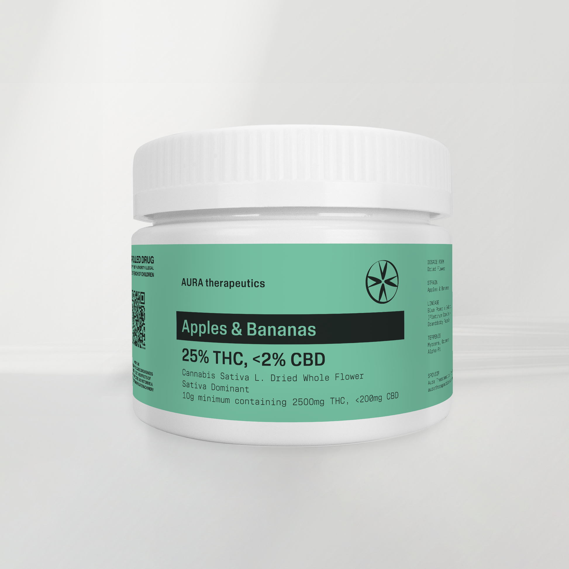 Aura Apples & Bananas is a high-THC product designed for chronic pain relief, anti-inflammatory effects, anxiety relief, insomnia relief, stress relief, and appetite stimulation. With a potent THC concentration of 25%, it is enriched with beneficial terpenes to enhance therapeutic benefits.