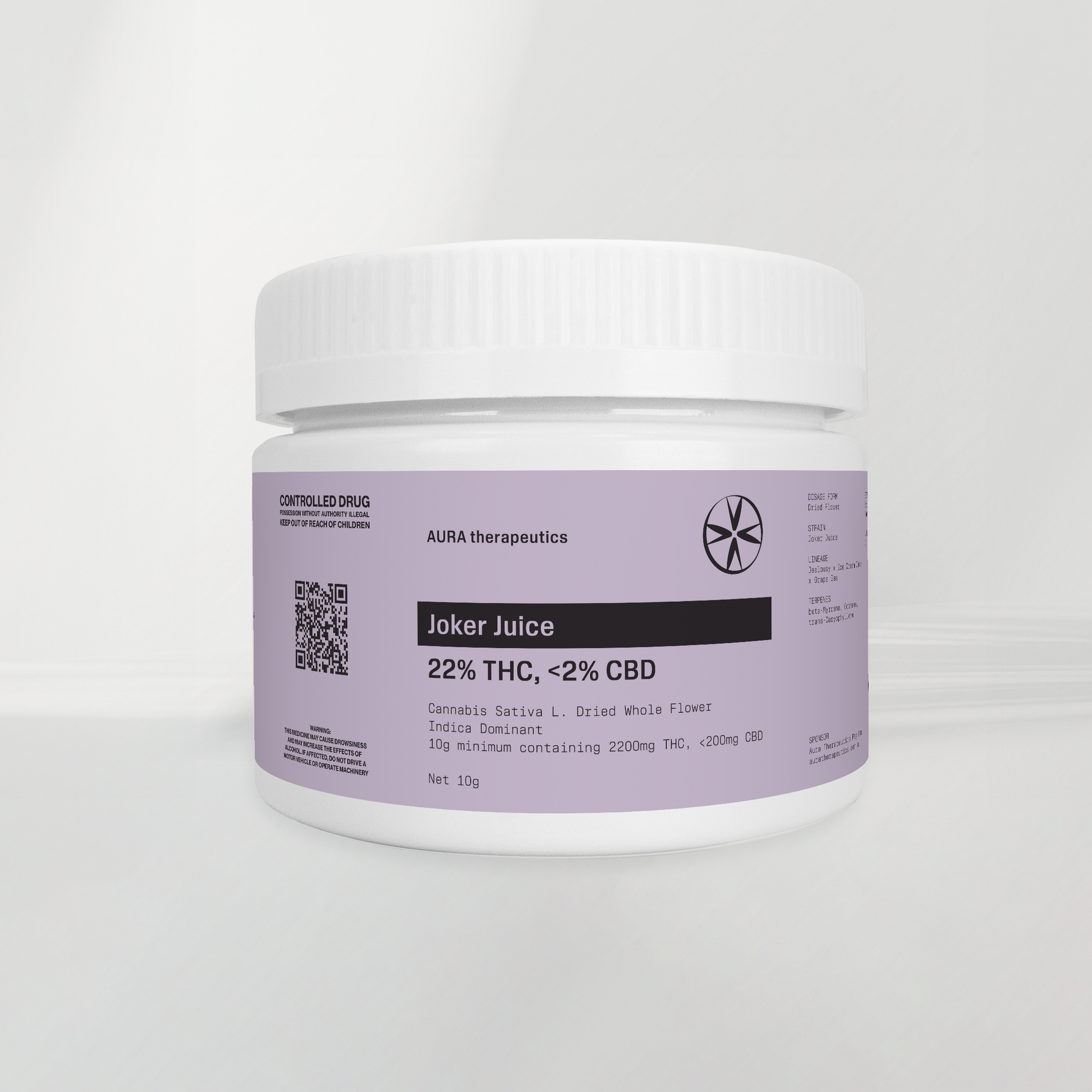 Aura Joker Juice is a high-THC product formulated for chronic pain relief and insomnia relief. With a THC concentration of 22%, it is enriched with beneficial terpenes to enhance therapeutic benefits.