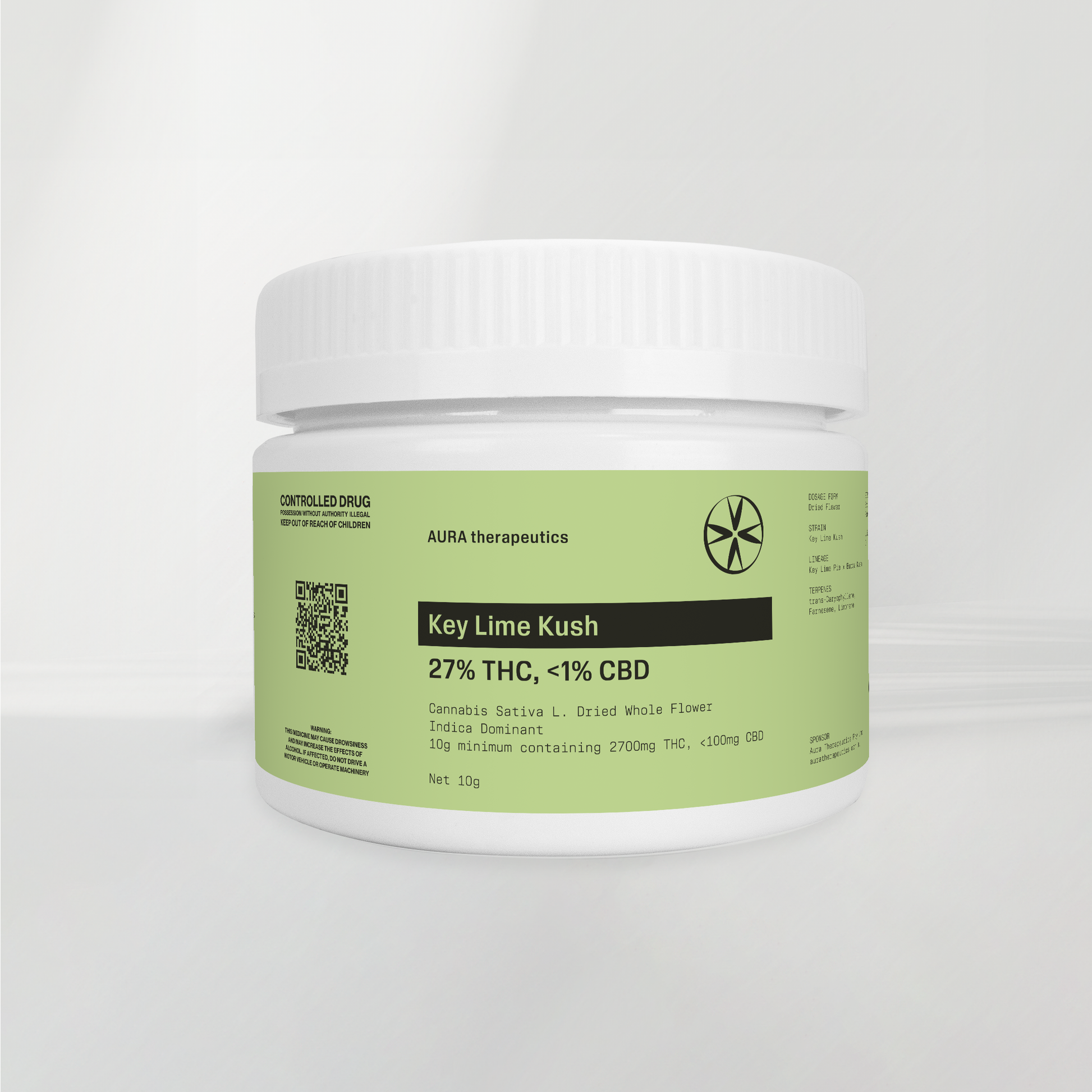 Aura Keylime Kush is a potent high-THC product formulated to provide relief for chronic pain, anxiety, and stress, while also acting as an appetite stimulant. With a THC concentration of 27%, it is enriched with beneficial terpenes to enhance its therapeutic benefits.